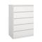 Een functionele en stijlvolle commode in wit met vijf ruime laden. De commode is gemaakt van MDF bedekt met melaminefolie voor een glad en duurzaam oppervlak dat gemakkelijk schoon te maken is. Het greeploze ontwerp zorgt voor een moderne en minimalistische look die in de meeste huizen en interieurs past