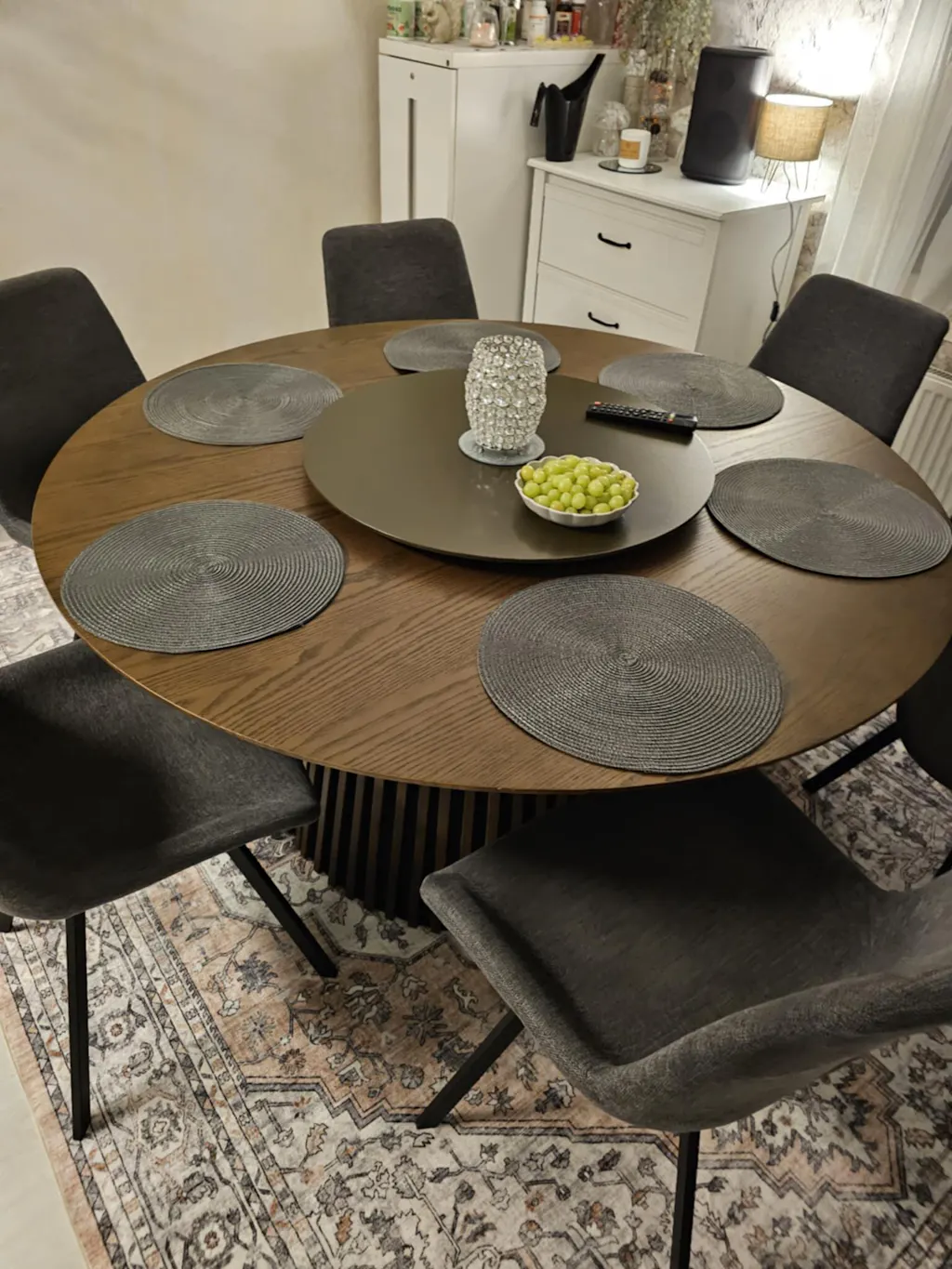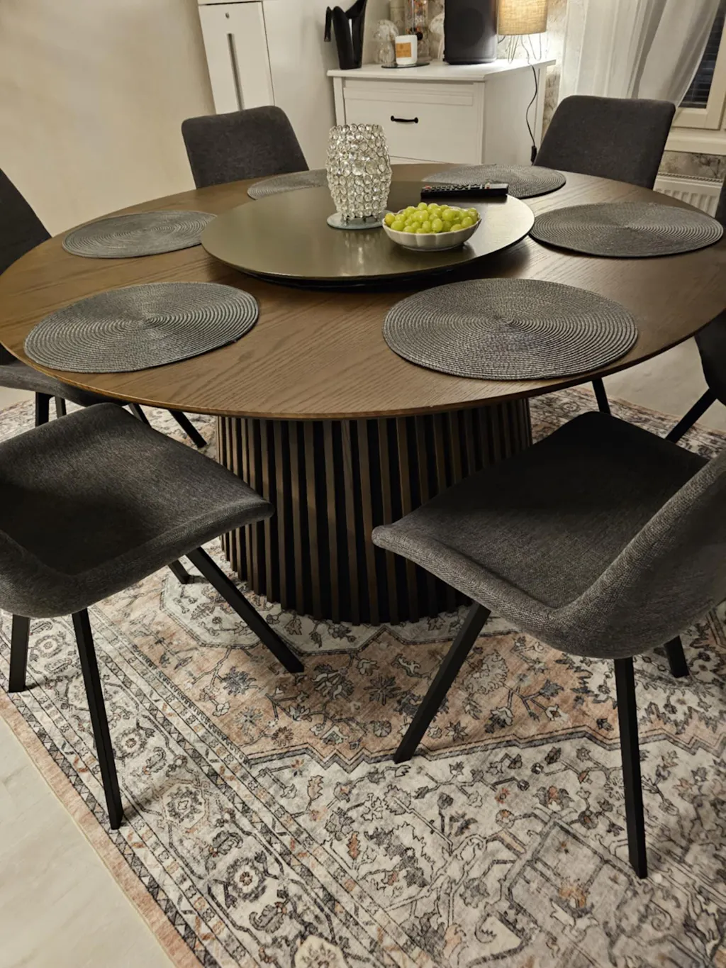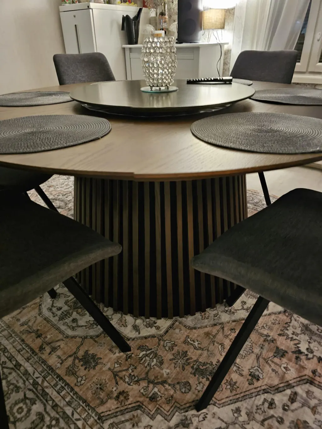 Bent u op zoek naar een grotere tafel met de mogelijkheid om veel gasten welkom te heten? Dan is de Lewis lamel eettafel in gerookt eiken fineer de ideale keuze. Deze ronde tafel is ontworpen om meerdere mensen te kunnen herbergen, en met de uitschuifoptie kunt u de grootte aanpassen naar behoefte. Met een standaard diameter van 150 cm kunt u gemakkelijk extra gasten toevoegen zonder zich zorgen te hoeven maken over ruimte.