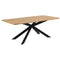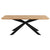 Het onderstel bestaat uit een opvallend kruisframe van matzwart gepoedercoat staal dat voor stabiliteit zorgt en de tafel een moderne, industriële look geeft. De combinatie van de warme houten afwerking en het ruwe staal zorgt voor een stijlvolle uitstraling die zowel in klassieke als eigentijdse huizen past