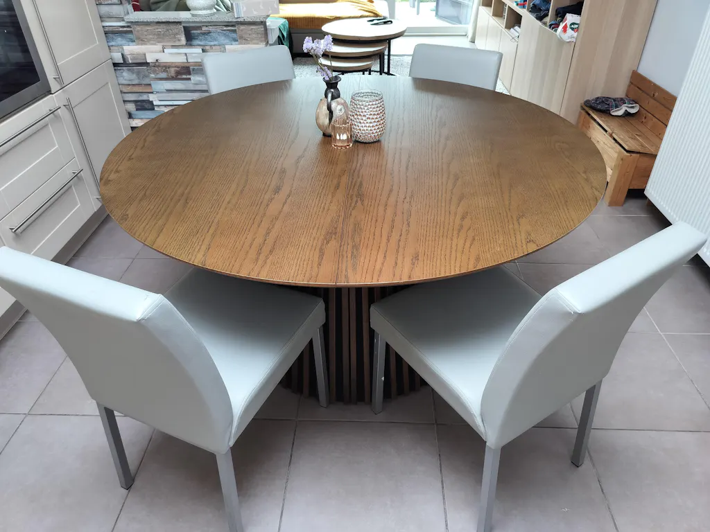 Bent u op zoek naar een grotere tafel met de mogelijkheid om veel gasten welkom te heten? Dan is de Lewis lamel eettafel in gerookt eiken fineer de ideale keuze. Deze ronde tafel is ontworpen om meerdere mensen te kunnen herbergen, en met de uitschuifoptie kunt u de grootte aanpassen naar behoefte. Met een standaard diameter van 150 cm kunt u gemakkelijk extra gasten toevoegen zonder zich zorgen te hoeven maken over ruimte.
