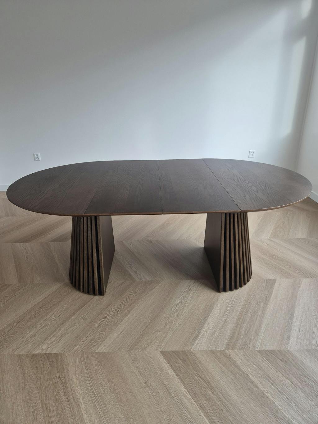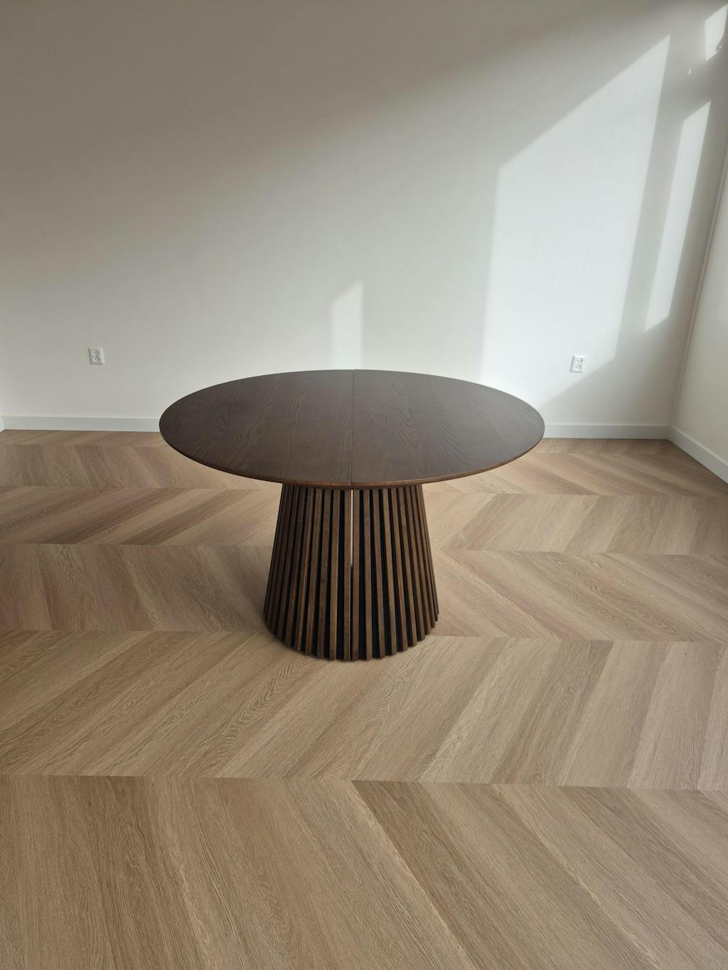 Hieronder vind je stofstalen voor Lewis - Ronde lamellen eettafel in gerookt eikenfineer met uittrekfunctie 120/160/200 cm - 2 inlegbladen inbegrepen
